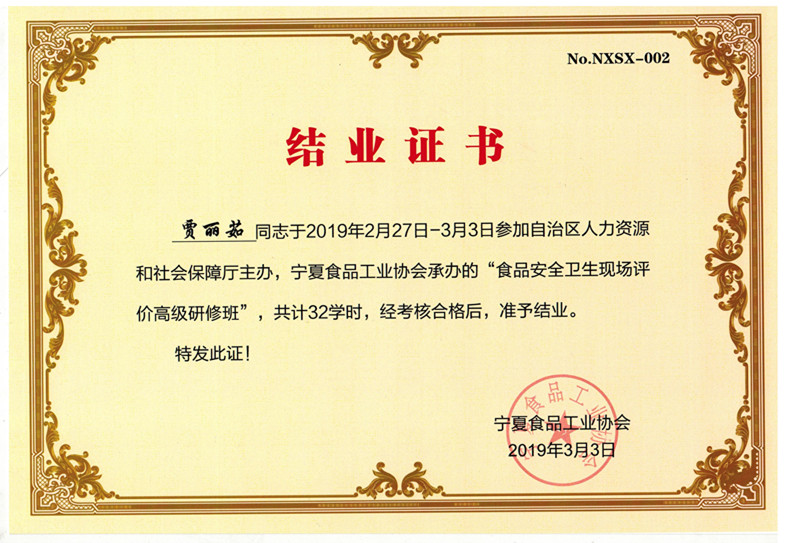 寧夏食品安全協(xié)會(huì)培訓(xùn)結(jié)業(yè)考核證書
